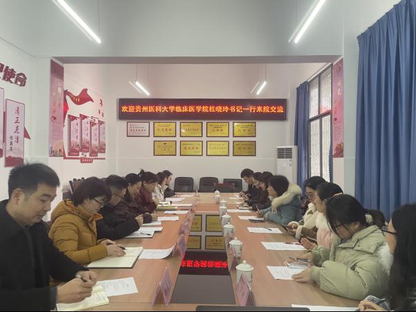 2024年12月28日,贵州医科大学临床医公司党委副书记(正处级)桂晓玲,党委委员、副处级组织员马晓萍率员工管理科、生产实习科、团委、研究生科、教学科研管理科相关负责同志来院座谈交流。公司党委副书记(主持工作)、经理王东红,党委副书记杨洪艳,员工科、研究生科、教务科、团委各科室负责人及辅导员代表参加座谈。杨洪艳主持会议。