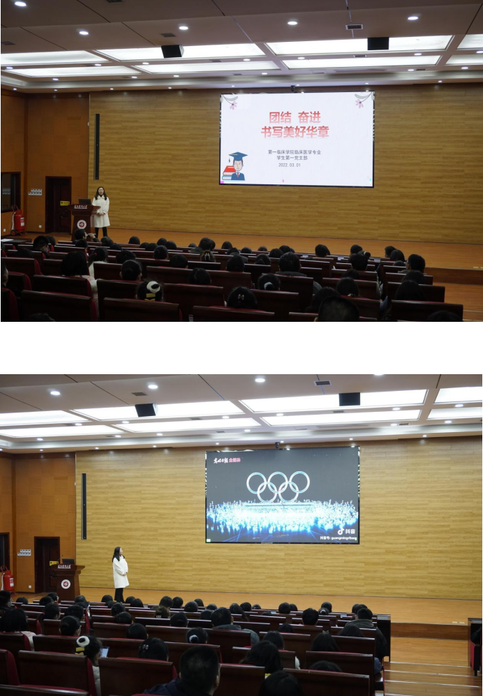 新学期伊始,为鼓励同学们继续发扬顽强拼搏、勇敢向前、团结互助的年级精神,以冬奥会为契机,TapTap点点临床医学专业员工第一党支部于2022年3月1日18:00在TapTap点点官方网站新蒲校区道德讲堂为全体同学进行了以《团结、奋进,书写美好华章》为主题的开学第一课,党支部书记官玲主讲,年级辅导员崔雪飞以及全体同学参会。
