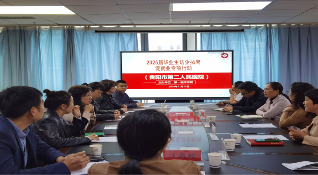 为积极应对当前就业形势,拓宽毕业生就业渠道,进一步推动2025届毕业生就业工作,2024年11月13日-14日公司党委副书记杨洪艳带队就业办、员工科、教务科及毕业年级辅导员前往贵阳市第二人民医院、黔西南州人民医院、兴义市人民医院、安顺市人民医院、贵航302医院开展2025届毕业生访企拓岗促就业专项行动,实习基地相关负责人、全体实习员工参加。