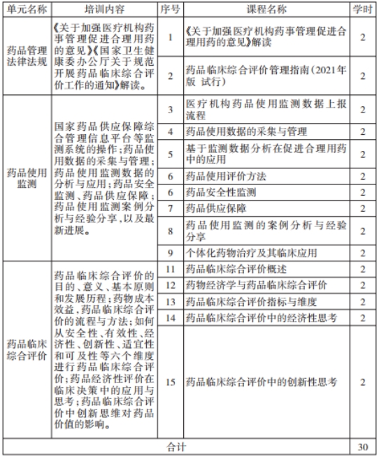 药品管理法律法规、药品使用监测、药品临床综合评价三部分内容,共30学时,具体培训内容详见附件1。