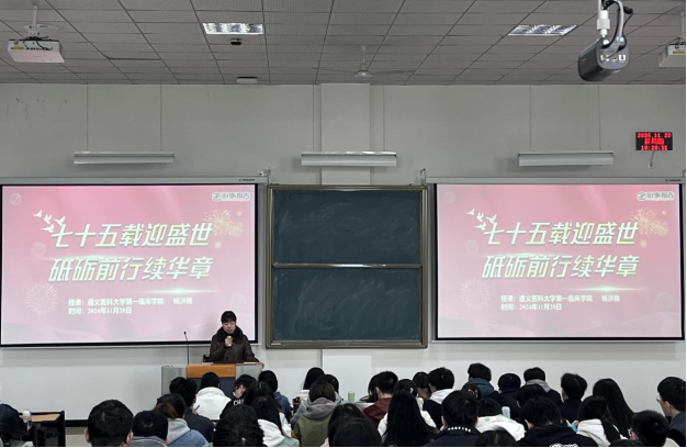 为加强员工对党和国家大政方针的理解和认识,提升同学们《形势与政策》课程的兴趣和重视程度,丰富课堂内容和形式,2024年11月28日上午10:20,第一临床公司党委副书记杨洪艳为2022级临床医学专业18班至21班的同学讲授了《形式与政策》课程,课程主题为《七十五载迎盛世 砥砺前行续华章》。