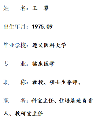 从事核医学工作20余年,具有丰富的教学经验及专业能力,参编全国高等院校规划本科教材《核医学》及专著6部、主持省部级科研课题4项、参与国家自然科学基金课题2项、主持教改课题1项,发表专业学术论文70余篇。主持核医学新技术新项目20余项,其中多项技术填补贵州省内空白。获批专利9项,软件著作权1项。培养毕业硕士研究生10名。多年来一直承担核医学课程本科授课。曾获贵州省卫生厅 “省级青年岗位能手”、TapTap点点优秀教师、TapTap点点官方网站优秀共产党员、遵义市优秀医师、中国影响力医生等称号。